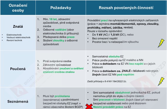 Osoby znalé i poučené mohou pracovat pouze na těch typech EZ, pro které získaly odbornou způsobilost. Rozdíly jsou jak v max. napětí, tak pracovním prostředí (bez/s nebezpečím výbuchu). Osoby poučené mohou za některých okolností pracovat i na EZ pod napětím, zpravidla však pod dohledem (viz infografika).